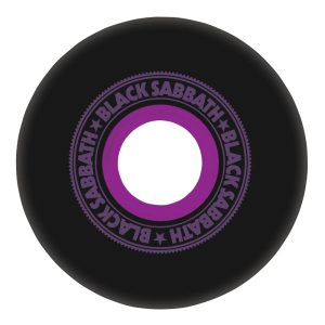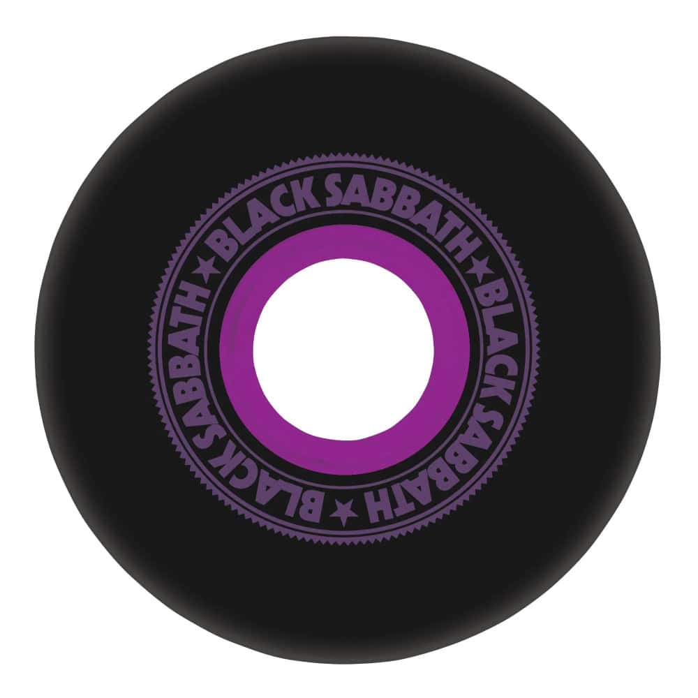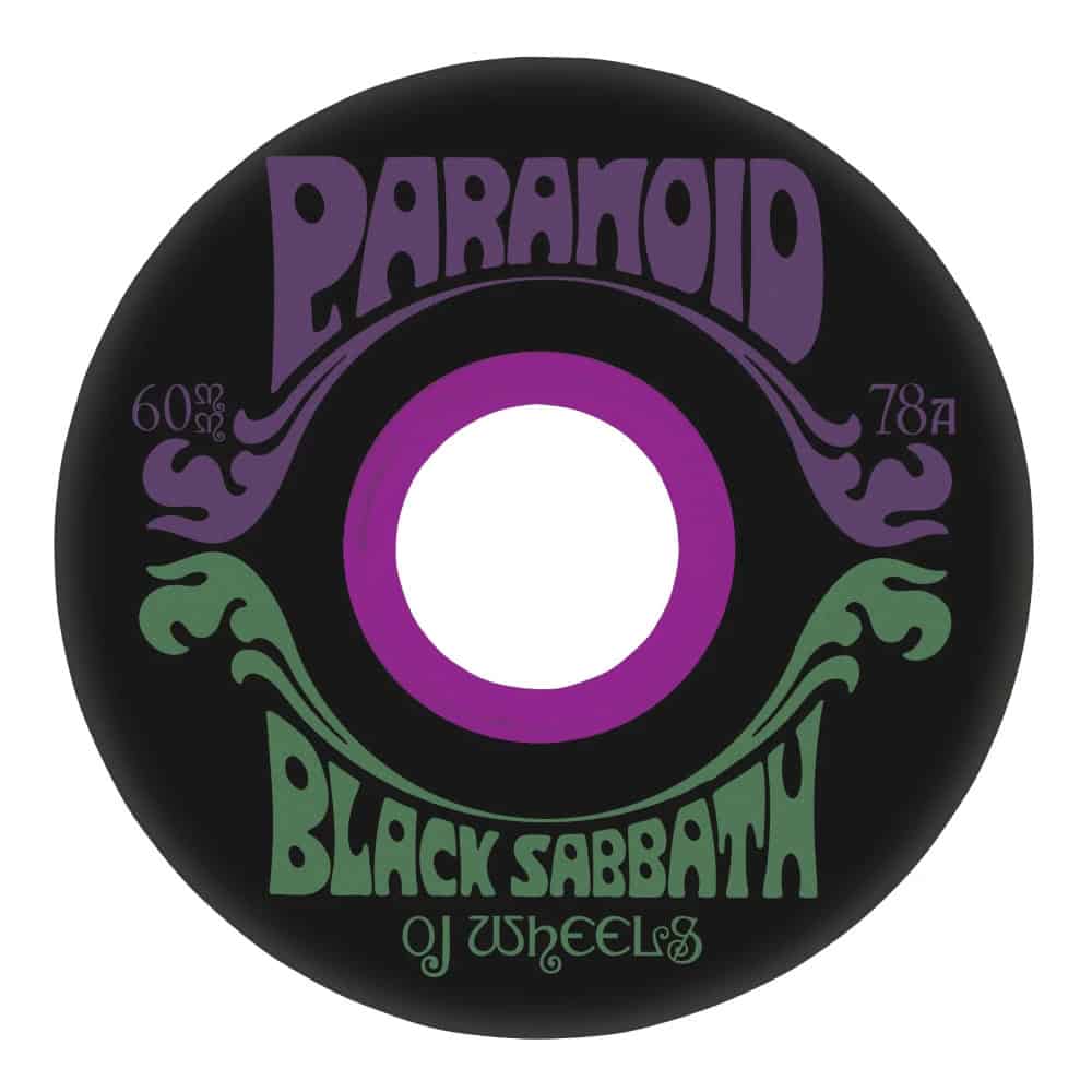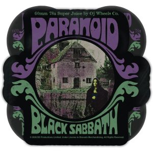 The OJ Wheels Black Sabbath Paranoid Black 60mm, 78a Super Juice Wheels feature Black Sabbath Paranoid artwork on our black 78a urethane with a purple core.
