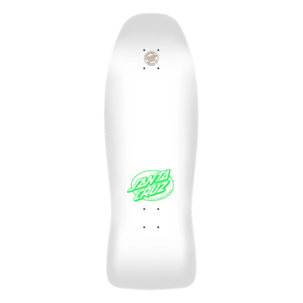 Santa Cruz Skateboards Jeff Kendall End of the World Reissue deck featuring spot matte and neon graphics on full dip white and 2025 reissue laser decktop logo.