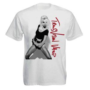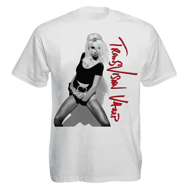 The Wendy James / Transvision Vamp T-Shirt famously worn by Kurt Cobain on multiple occasions including live performance on MTV. This t-shirt is produced on 100% soft white cotton in a classic unisex round neck, straight cut shape.